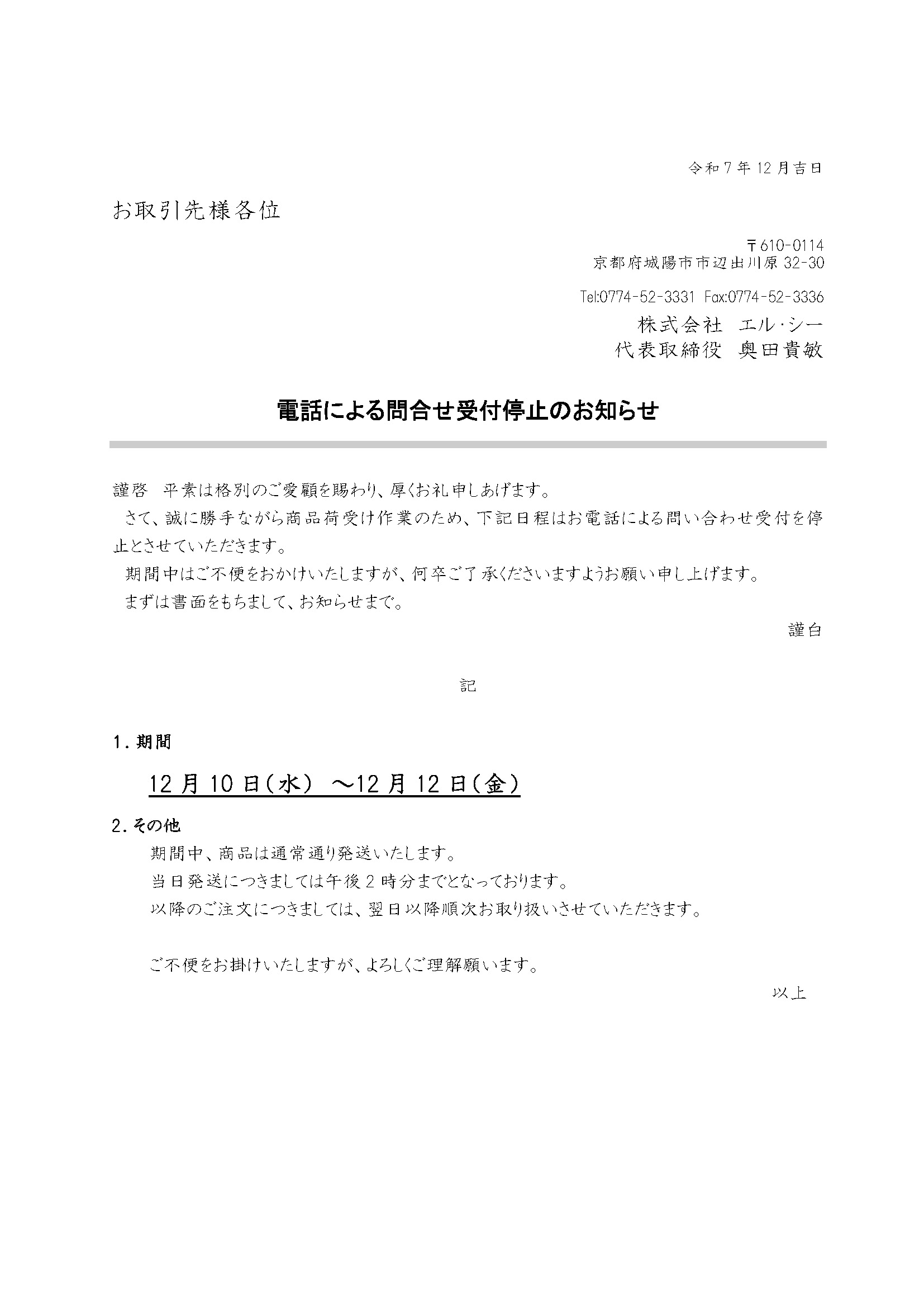 電話受付に関して 電話による問い合わせ受け付け停止のお知らせ