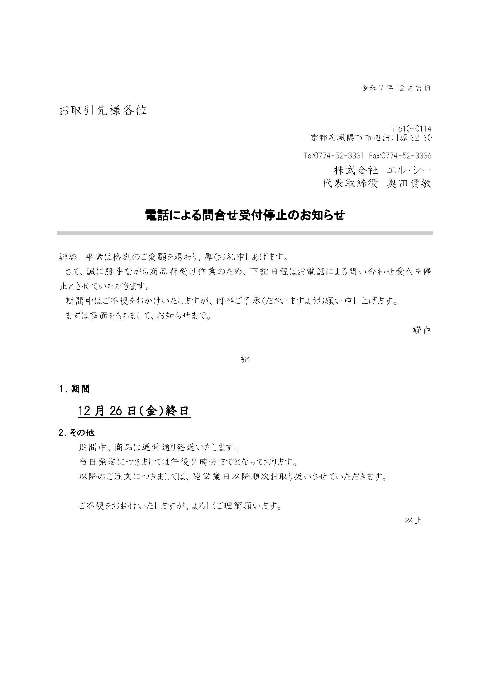 電話受付に関して 電話による問い合わせ受け付け停止のお知らせ