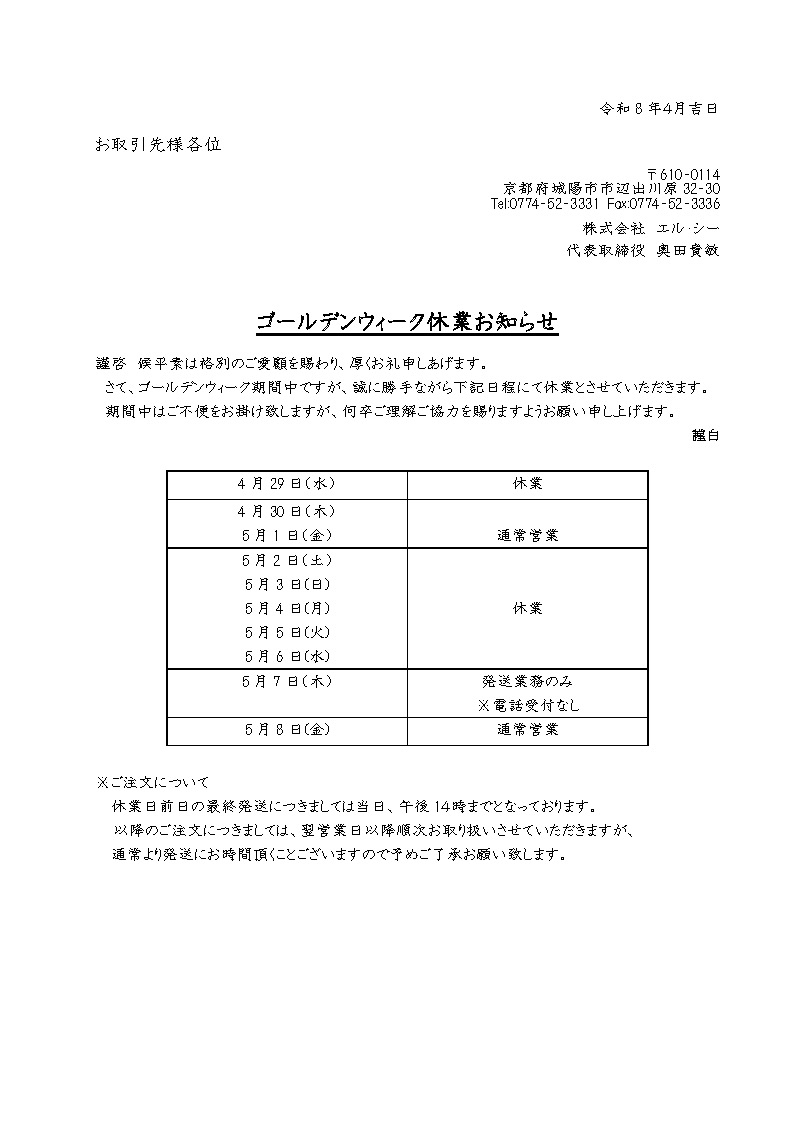 GW休業のお知らせ ゴールデンウィーク休業のお知らせ