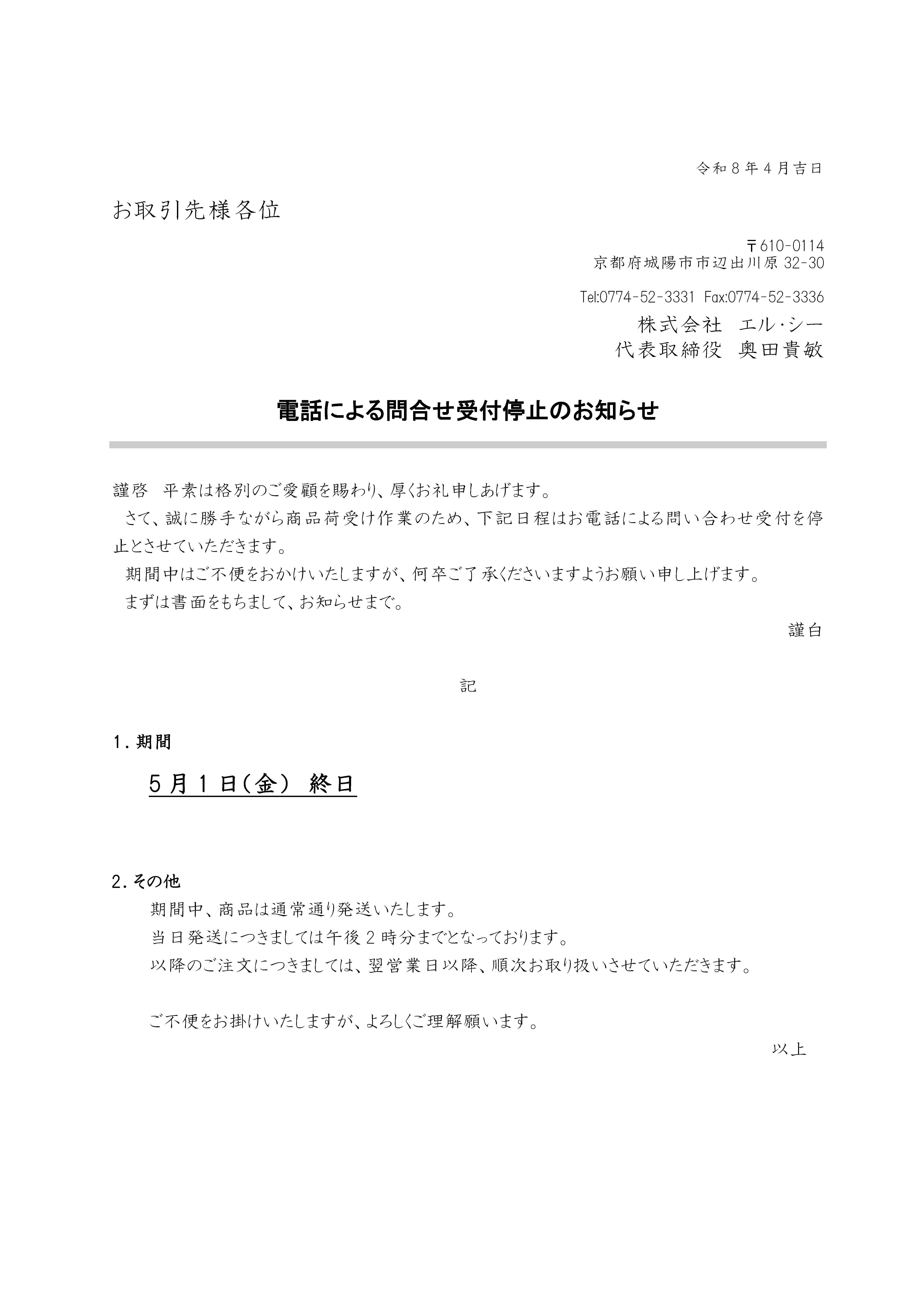 電話受付に関して 電話による問い合わせ受け付け停止のお知らせ