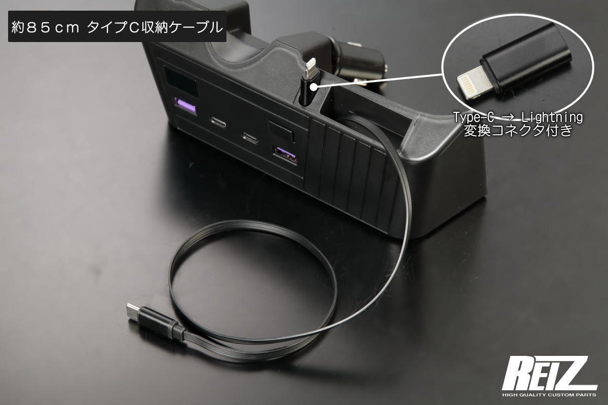最大約85cmまで伸縮可能で、後部座席からも充電可能です。